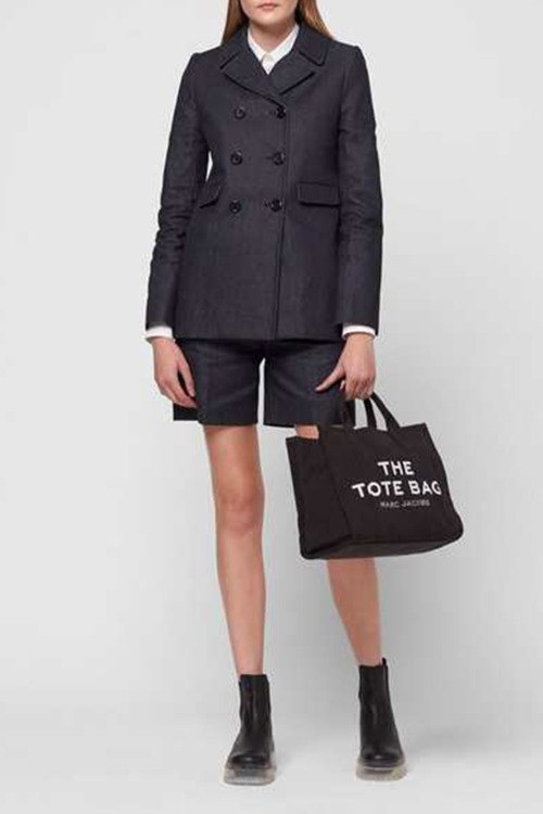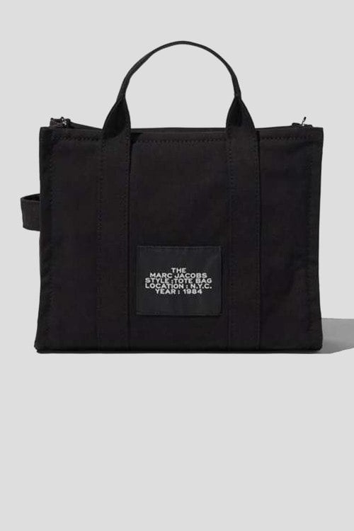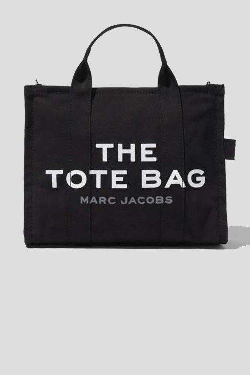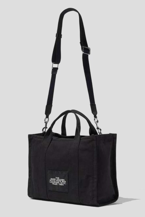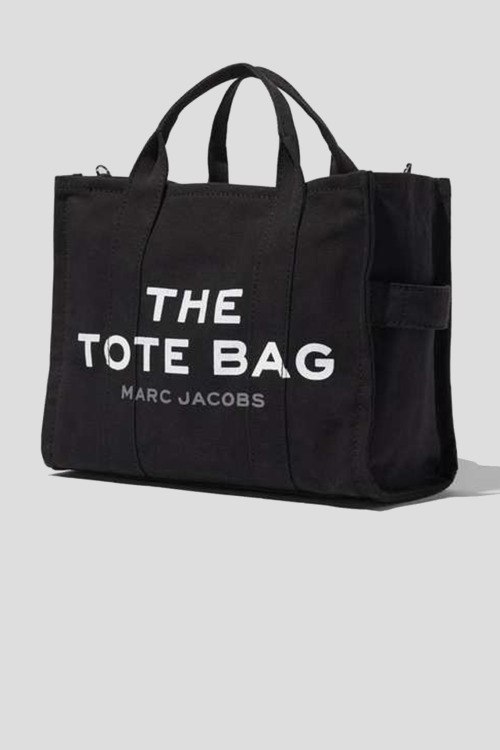 Женская черная сумка-тоут из холщовой непромокаемой ткани от Marc Jacobs (Марк Джейкобс). Модель: TRAVELER TOTE. Внутренний карман на молнии, одно отделение, застежка на молнию, две несъемные ручки, съемный плечевой ремень, печатный принт с логотипом бренда. Высота ручки: 24 см. Размер: 34 х 15 х 27 см