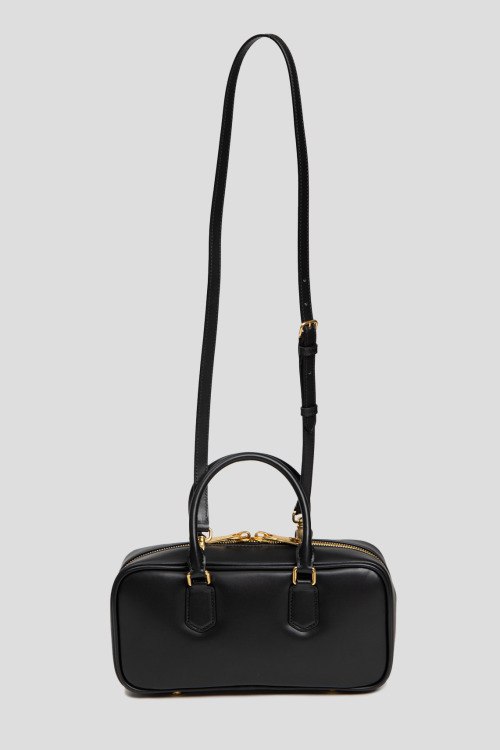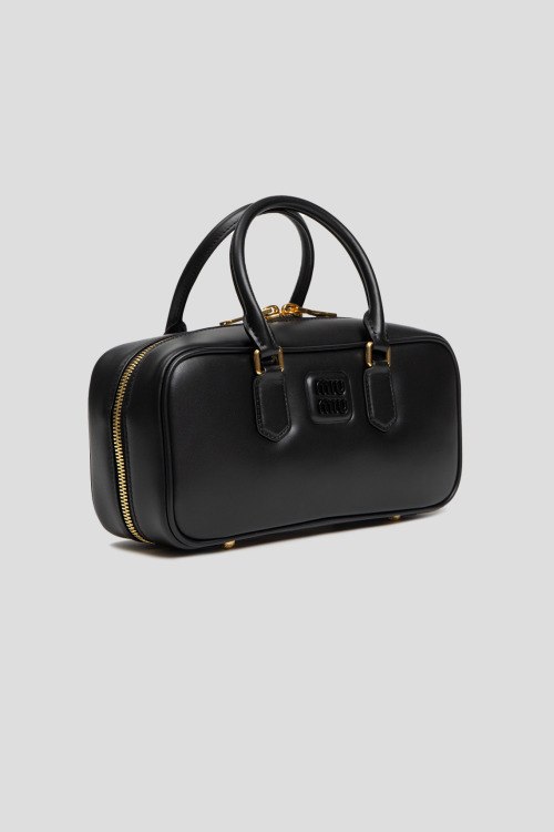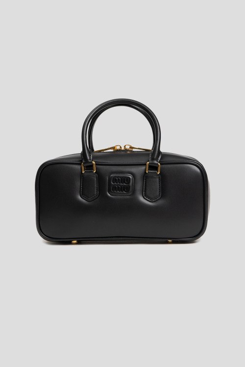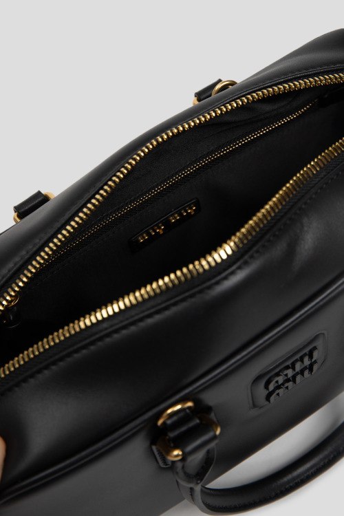 Женская черная кожаная сумка-тоут Arcadie от Miu Miu (Миу Миу). Модель из гладкой кожи, логотип спереди, золотистая фурнитура, две круглые ручки, съемный плечевой ремень, застежка-молния, одно отделение, внутренний карман на молнии. Комплектация: брендовый пакет, коробка и пыльник. Размеры: ширина 27,5 см, высота 13 см, глубина - 9 см