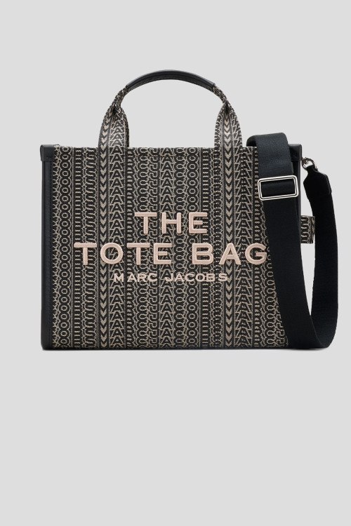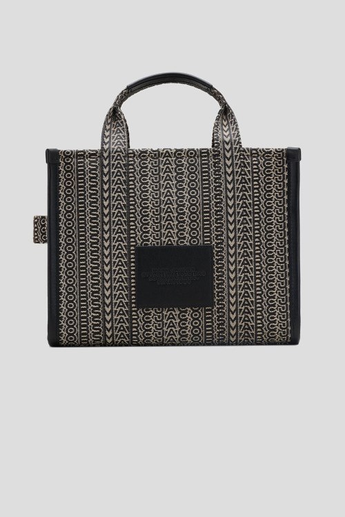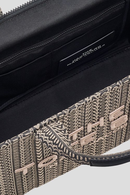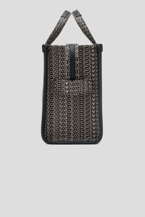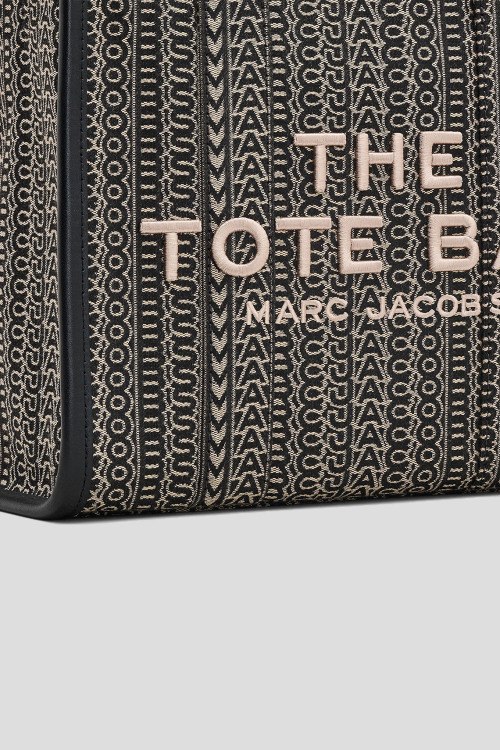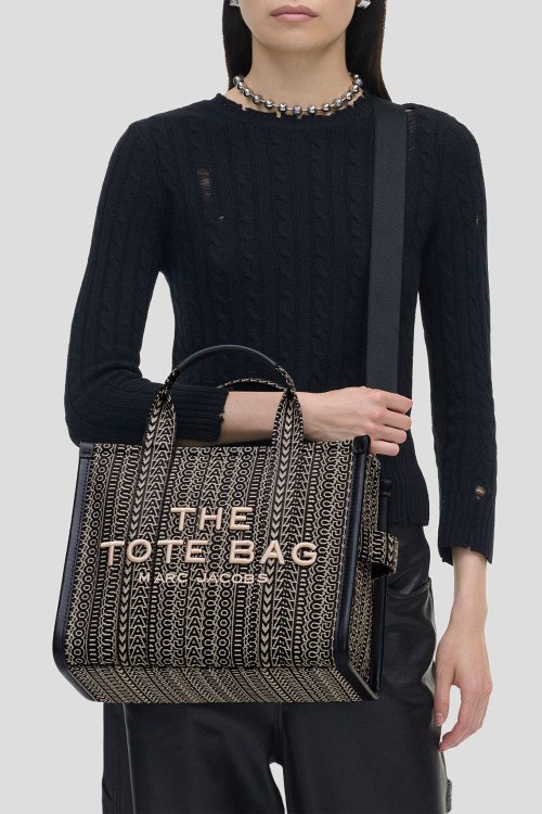 Детали: Женская черно-бежевая текстильная сумка-тоут The Monogram Jacquard Medium от Marc Jacobs (Марк Джейкобс). Монограмма по всей поверхности, вышитый логотип, две круглые ручки, съемный плечевой ремень, золотистая фурнитура, застежка-молния, одно отделение, один внутренний карман. Размеры: глубина 15 см, ручка 12 см, высота 27 см, ремешок 144 см, ширина 34 см