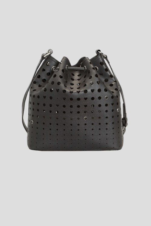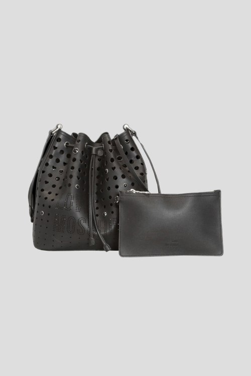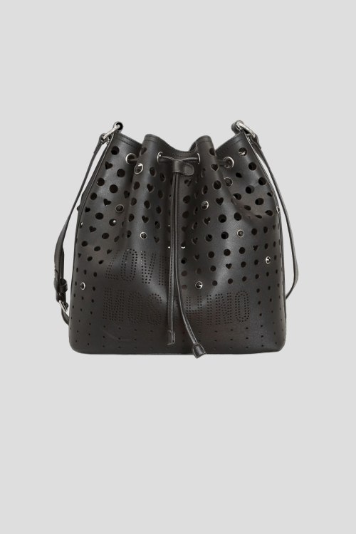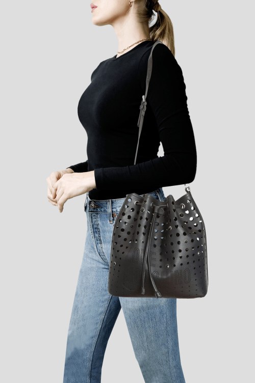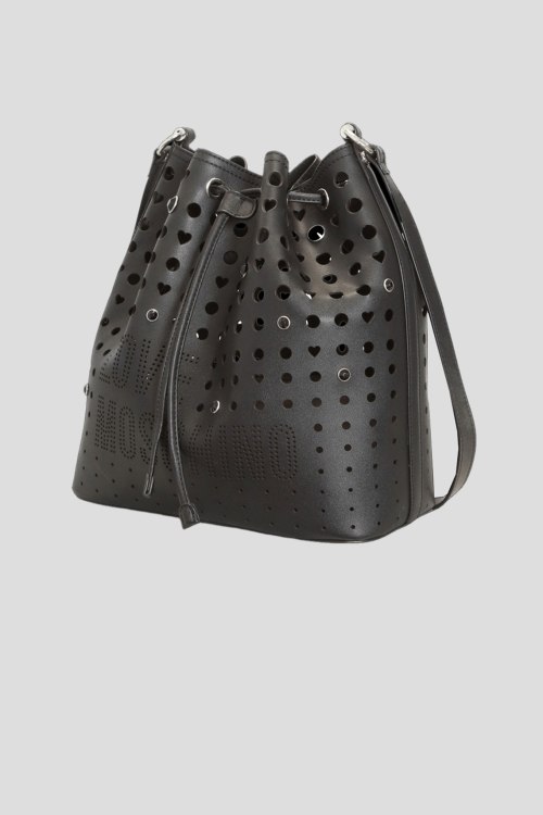 Детали: Женская черная кожаная сумка-ведро от Moschino (Москино). Модель из гладкой кожи, дизайн с перфорацией, верх на затяжке, регулируемый плечевой ремень, внутренняя косметичка, одно отделение. Размеры: высота: 29 см, ширина: 28 см, глубина: 14 см, плечевой ремень: 33–43 см