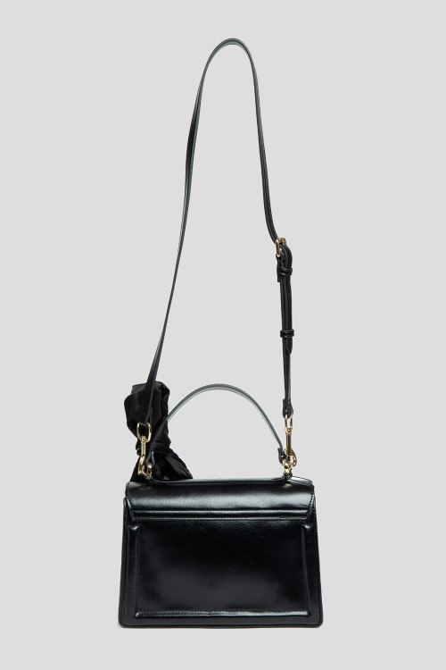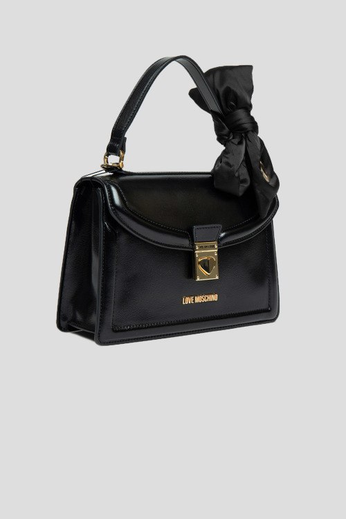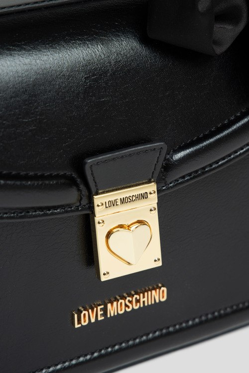 Детали: Женская черная сумка-тоут из экокожи от Love Moschino (Лав Москино). Значок с логотипом, золотистая фурнитура, круглая ручка с текстильным бантом, съемный плечевой ремень, застежка на магнит, одно отделение. Размеры: 20,5 х 18,5 х 9 см