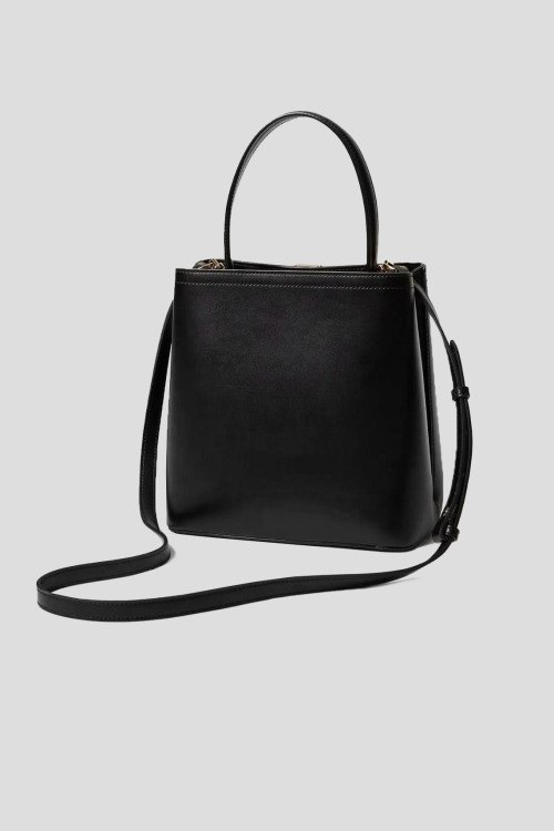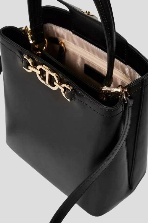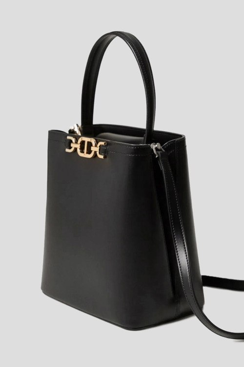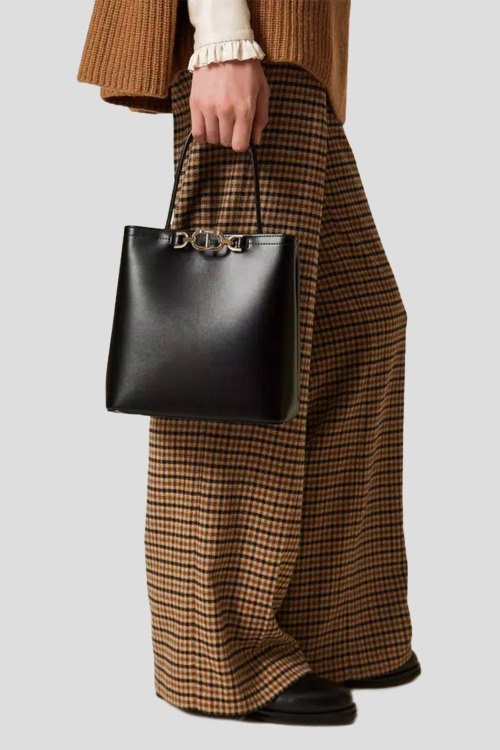 Детали: Женская черная сумка-тоут из экокожи от TWINSET (Твинсет). Модель из гладкой кожи, золотистая фурнитура, две круглые ручки, съемный плечевой ремень, два отделения. Размеры: 22 x 23 x 13 см