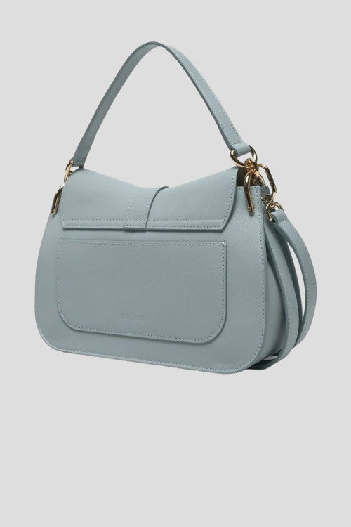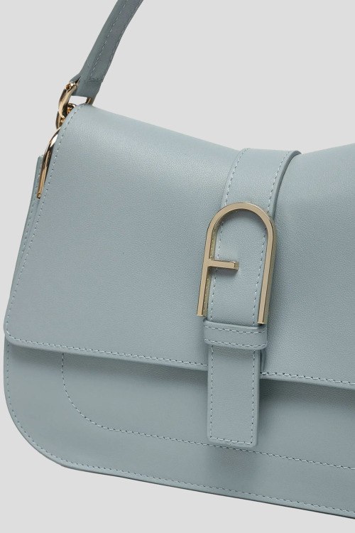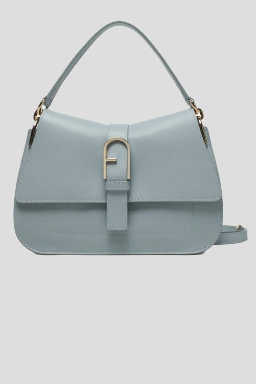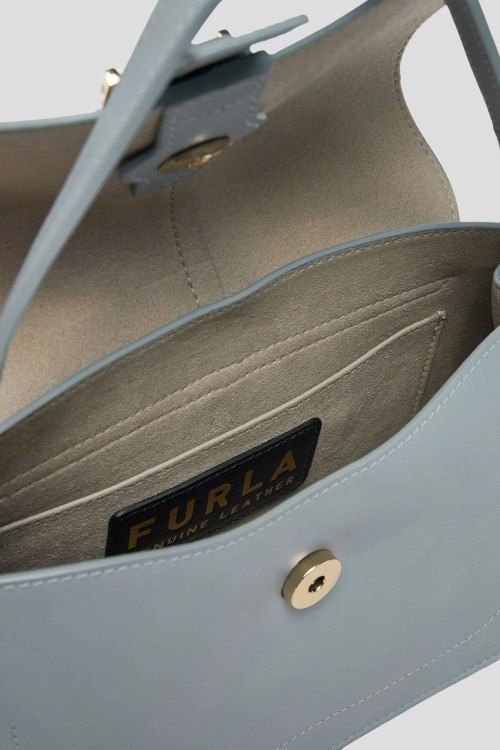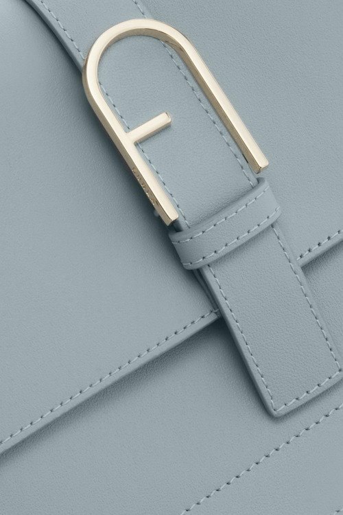 Детали: Женская голубая кожаная сумка-тоут Flow от Furla (Фурла). Модель из гладкой кожи, золотистая фурнитура, металлический логотип, застежка на магнит, одно отделение, круглая ручка, съемный плечевой ремень. Размеры: 25 х 15,5 х 8 см