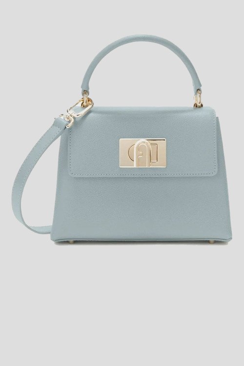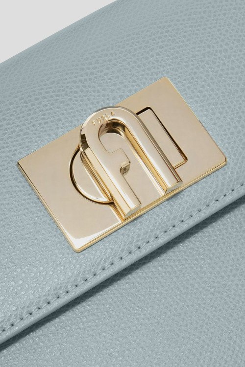 Детали: Женская голубая кожаная сумка-тоут Nuvola от Furla (Фурла). Модель из зернистой кожи, золотистая фурнитура, застежка на поворотный замок, одно отделение, круглая ручка, съемный плечевой ремень. Размеры: 21 x 16 x 9 см