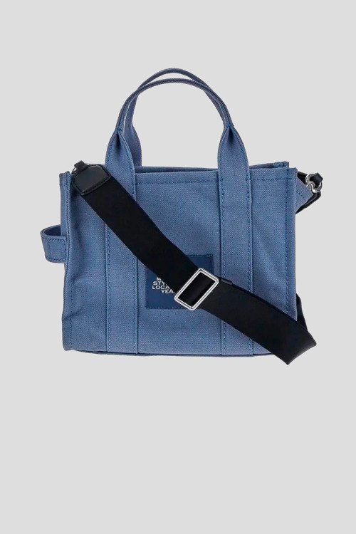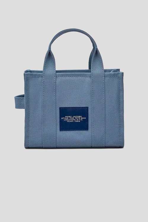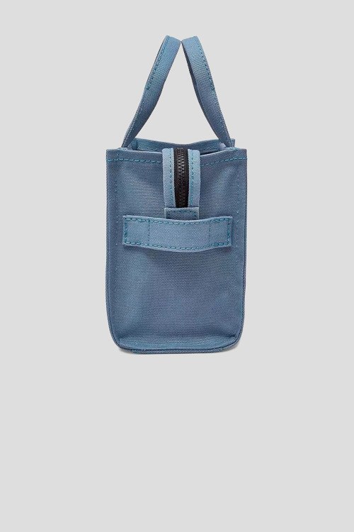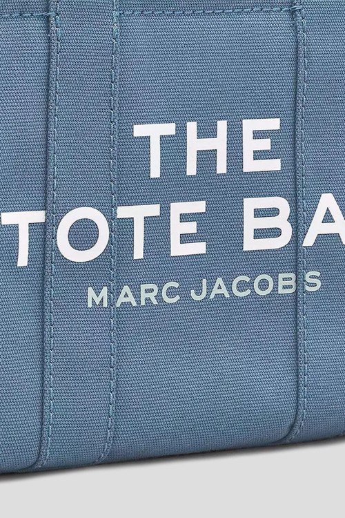 Детали: Женская голубая сумка-тоут из канвы The Canvas Small от Marc Jacobs (Марк Джейкобс). Принт с логотипом, серебристая фурнитура, две круглые ручки, съемный плечевой ремень, застежка-молния, одно отделение. Размеры: 26 x 13 x 21 см; высота ручек 11 см; максимальная длина плечевого ремня 144 см