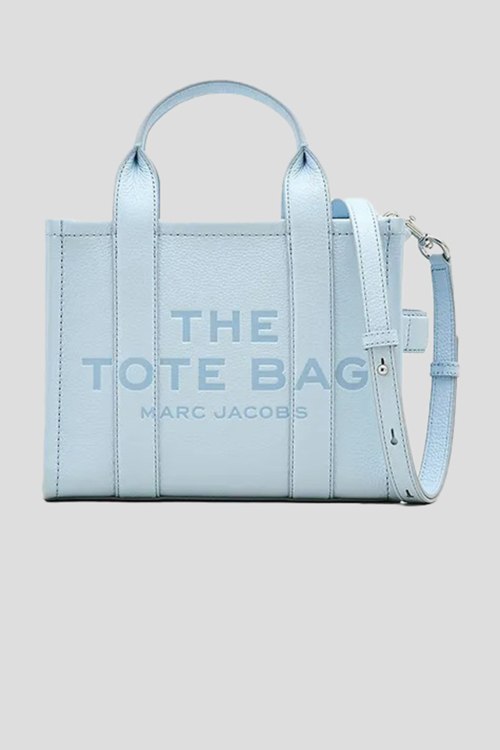 Детали: Женская голубая кожаная сумка-тоут The Leather Small Tote Bag от Marc Jacobs (Марк Джейкобс). Модель из зернистой кожи, тиснение логотипа, золотистая фурнитура, две круглые ручки, съемный плечевой ремень, застежка-молния, одно отделение. Размеры: 34 x 15 х 27 см