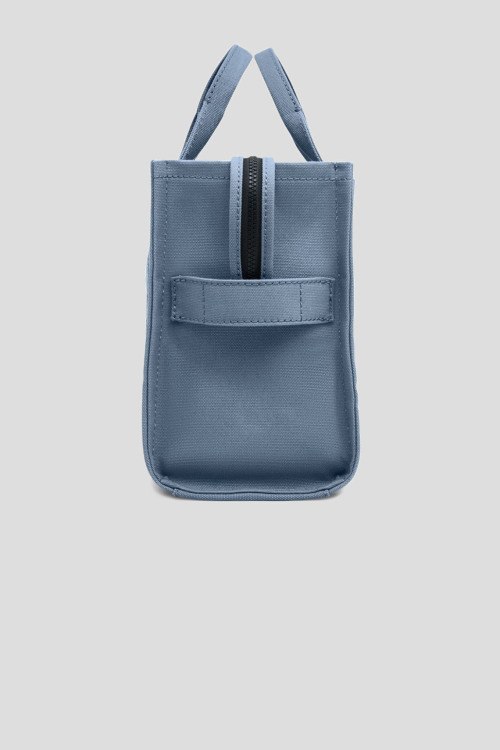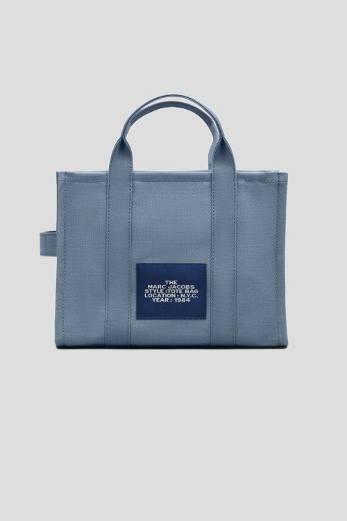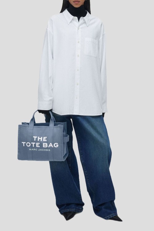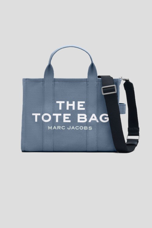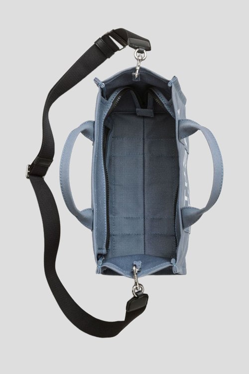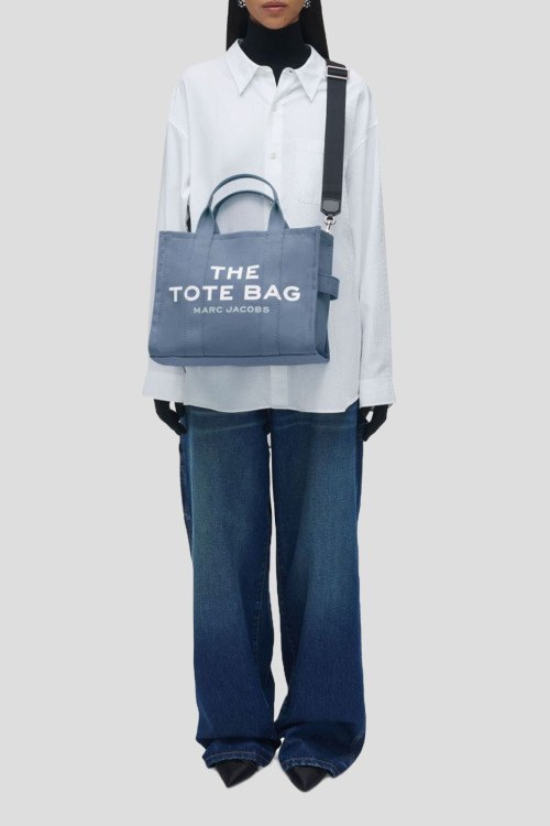 Женская темно-голубая сумка-тоут из канвы The Canvas Medium от Marc Jacobs (Марк Джейкобс). Принт с логотипом спереди, нашивка с логотипом сзади, две круглые ручки, съемный плечевой ремень, серебристая фурнитура, застежка-молния, одно отделение, один внутренний карман. Размеры: 34 x 15 х 27 см