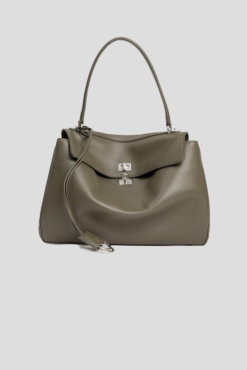 Женская кожаная сумка-тоут цвета хаки Rodeo Midi от Balenciaga (Баленсиага). Модель из гладкой кожи, серебристая фурнитура, круглая ручка, съемный плечевой ремень, съемная подвеска с логотипом, застежка на поворотный замок, два отделения, внутренний карман на молнии. Комплектация: коробка и пыльник. Размеры: высота 23 см, ширина 34 см, глубина 11 см