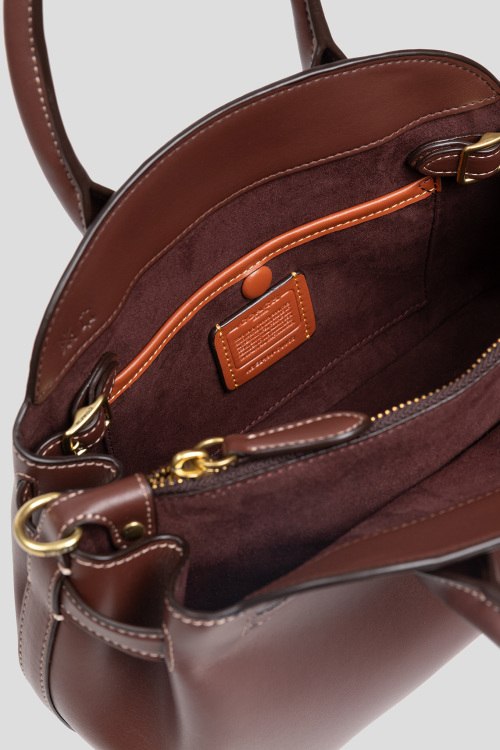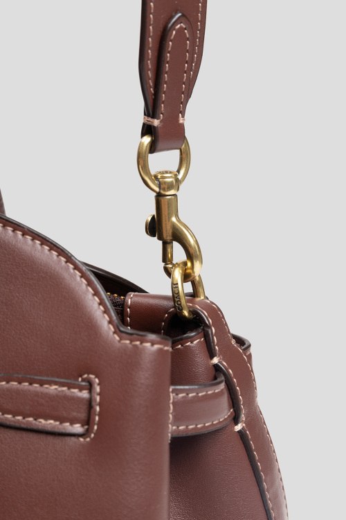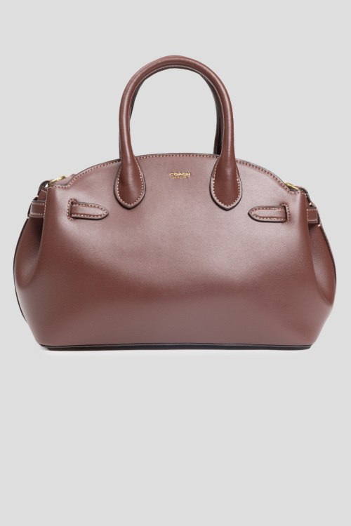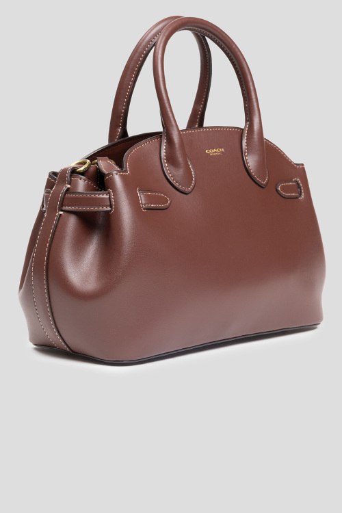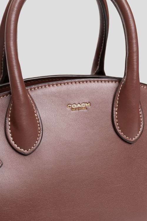 Детали: Женская коричневая кожаная сумка-тоут Empire от Coach (Коуч). Модель из гладкой кожи, логотип спереди, золотистая фурнитура, две круглые ручки, съемный плечевой ремень, застежка-молния, три отделения. Размеры: 32 х 19 х 12 см