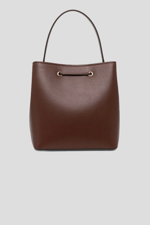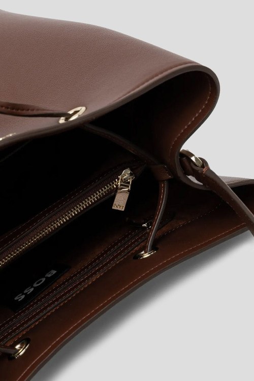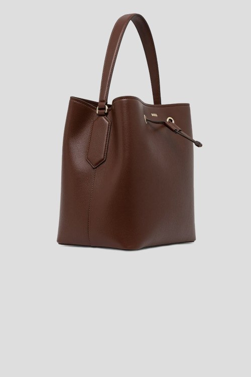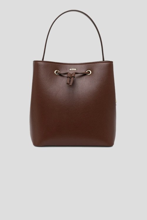 Женская коричневая сумка-тоут из экокожи от Hugo Boss (Хуго Босс). Два отделения, карман-перегородка, застежка на кулиску, внутренний карман на молнии, тиснение с логотипом бренда, несъемная ручка. Измерения: 28 x 26 x 17 см