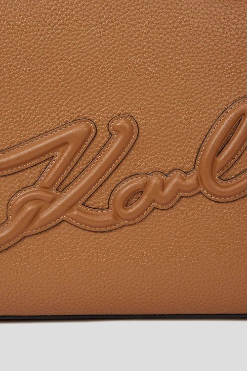 Детали: Женская сумка-тоут из экокожи цвета кэмел K/Square Medium от Karl Lagerfeld (Карл Лагерфельд). Модель из зернистой кожи, логотип спереди, серебристая фурнитура, две ручки, застежка-молния, одно отделение. Размеры: 32 x 26 x 13 см