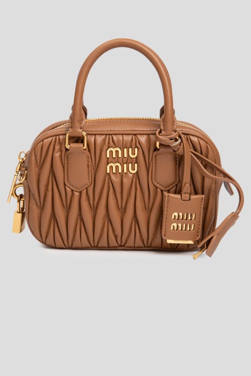 Детали: Женская коричневая кожаная сумка-тоут Arcadie от Miu Miu (Миу Миу). Модель из гладкой кожи, стеганый дизайн, значок с логотипом, подвеска с логотипом, золотистая фурнитура, золотистый замочек, застежка-молния, одно отделение, две круглые ручки, регулируемый плечевой ремень. Комплектация: пыльник и коробка. Размеры: высота - 14 см, ширина - 21 см, глубина - 6 см