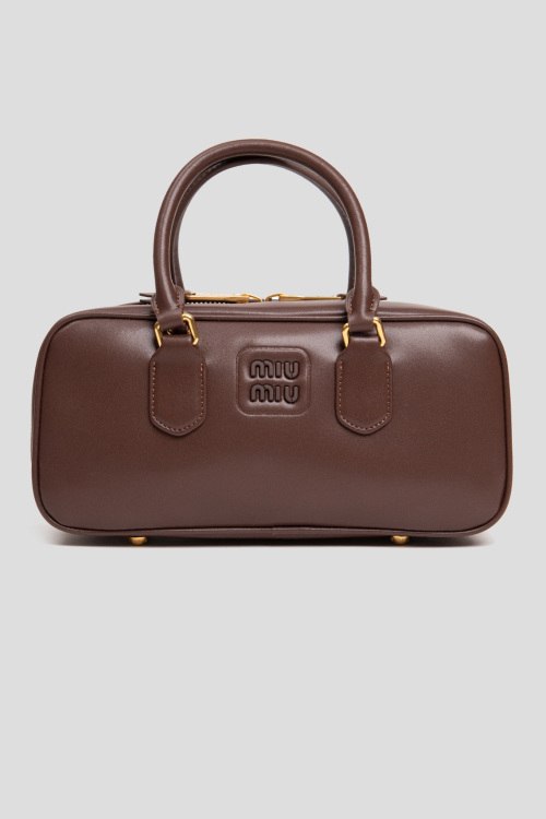 Детали: Женская темно-коричневая кожаная сумка-тоут Arcadie от Miu Miu (Миу Миу). Модель из гладкой кожи, значок с логотипом, золотистая фурнитура, застежка-молния, одно отделение, две круглые ручки, регулируемый плечевой ремень. Комплектация: пыльник и коробка. Размеры: высота - 14 см, ширина - 27 см, глубина - 9 см