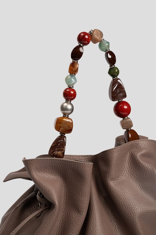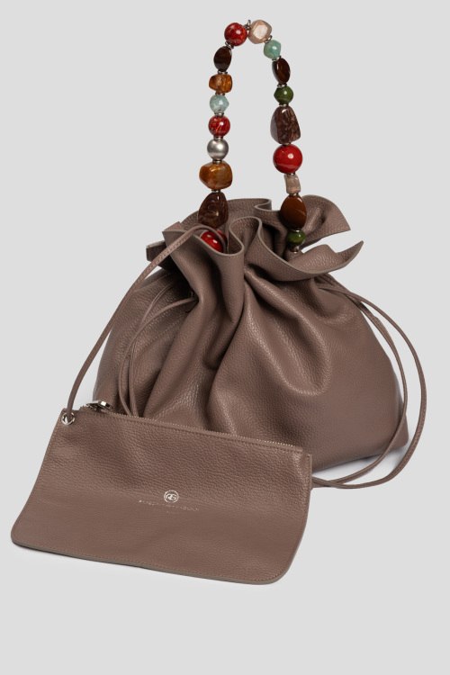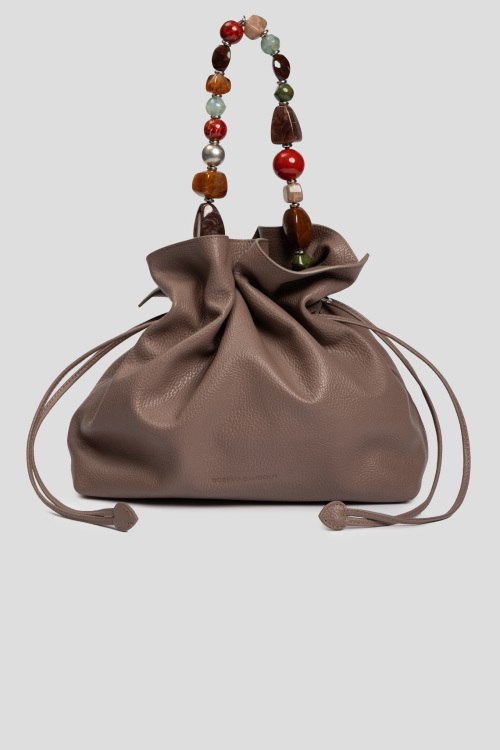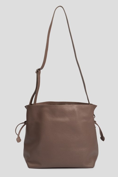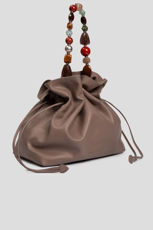 Детали: Женская кожаная сумка-мешок цвета тауп от Roberta Gandolfi (Робэрта Гандолфи). Модель из зернистой кожи, тиснение логотипа спереди, верхняя декорированная ручка, плечевой ремень, верх на затяжке, застежка на магнит, одно отделение, внутренний кошелек с логотипом. Размеры: высота 30 х ширина 31 х глубина 15 см