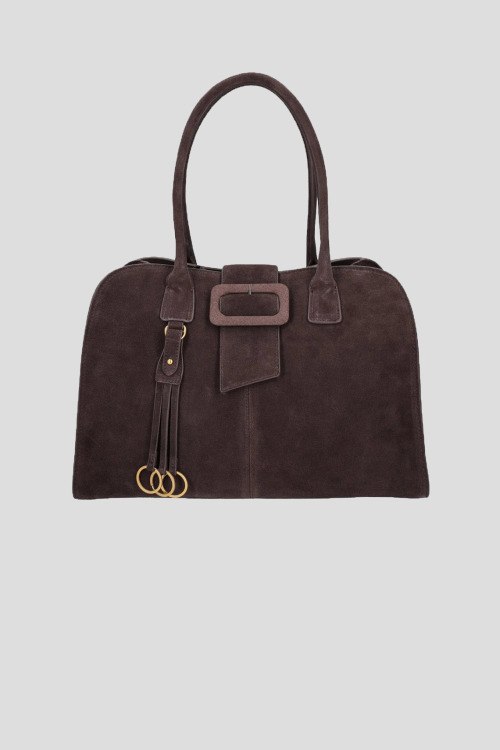Детали: Женская темно-коричневая замшевая сумка-тоут Rachel от Tosca Blu (Тоска Блу). Золотистая фурнитура, подвеска с кольцами, две круглые ручки, застежка на магнит, одно отделение. Размеры: 26 x 37 x 19 см