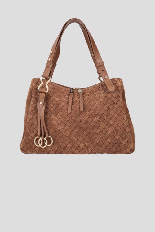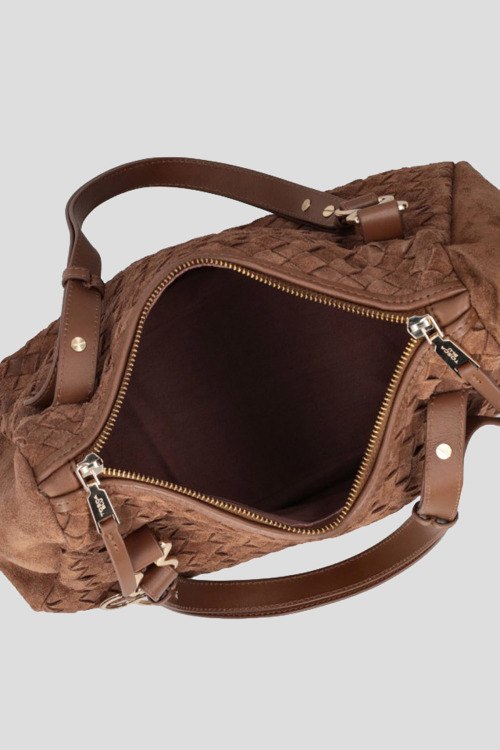 Детали: Женская коричневая замшевая сумка-тоут Susan от Tosca Blu (Тоска Блу). Плетеный дизайн, золотистая фурнитура, нашивка с логотипом сбоку, подвеска с кольцами, две кожаные ручки, застежка-молния, одно отделение. Размеры: 23 x 34 x 13 см