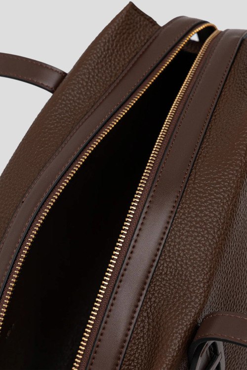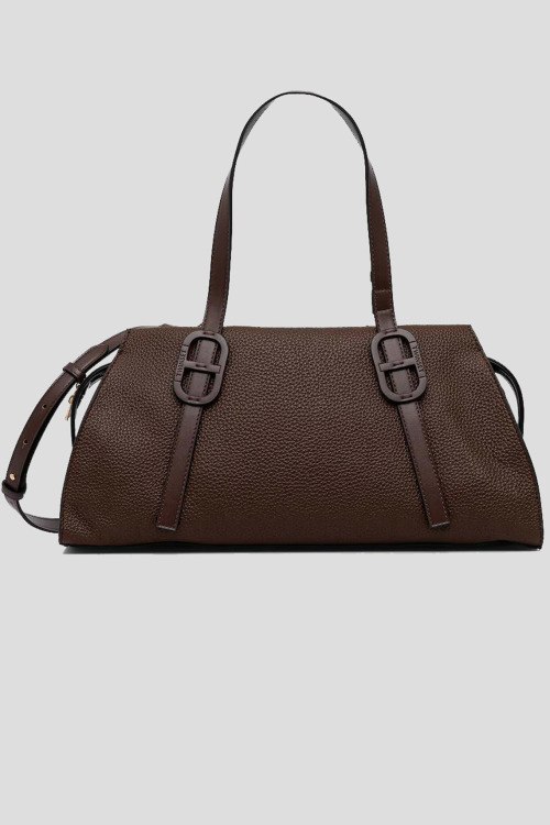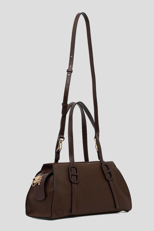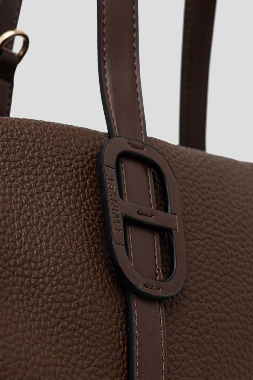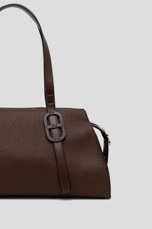 Детали: Женская темно-коричневая сумка-тоут из экокожи от TWINSET (Твинсет). Модель из зернистой кожи, золотистая фурнитура, две круглые ручки, съемный плечевой ремень, застежка-молния, одно отделение. Размеры: 40 х 18 х 13 см