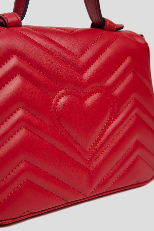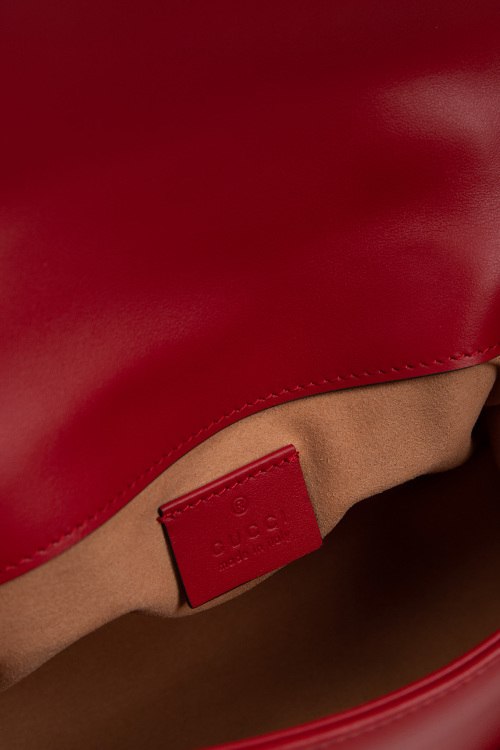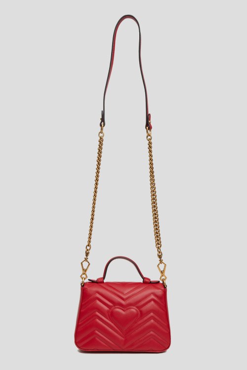 Женская красная сумка-тоут GG Marmont из натуральной кожи от Gucci (Гуччи). Стеганый дизайн, одно отделение, застежка с клапаном на магнит, металлическая фурнитура золотистого цвета, тиснение с логотипом бренда, верхняя ручка, плечевой ремень-цепочка, в комплекте пыльник и фирменная упаковка. Измерения: ширина - 18 см, высота - 15 см, глубина - 8 см