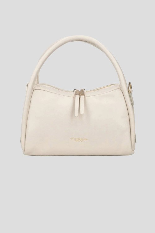Детали: Женская кожаная сумка-тоут молочного оттенка Cloe от Tosca Blu (Тоска Блу). Модель из гладкой кожи, логотип спереди, золотистая фурнитура, две круглые ручки, съемный плечевой ремень, застежка-молния, одно отделение. Размеры: 17 х 25 х 10 см
