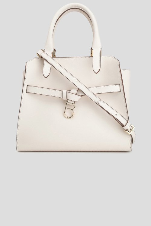 Женская кожаная сумка-тоут молочного оттенка от Tosca Blu (Тоска Блу). Модель из гладкой кожи, подвеска с логотипом, золотистая фурнитура: две круглые ручки, регулируемые плечевой ремень, застежка-молния, одно отделение. Размеры: 28 х 24 х 14 см