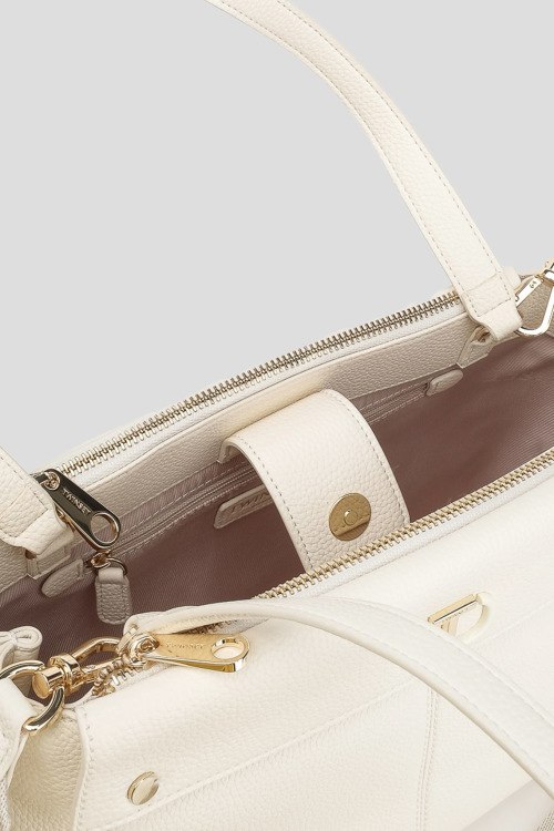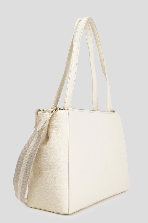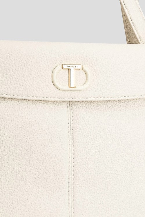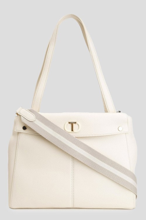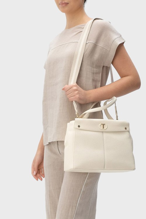 Детали: Женская сумка-тоут молочного оттенка из экокожи I'm Not A Lady от TWINSET (Твинсет). Модель из зернистой кожи, значок с логотипом, золотистая фурнитура, две круглые ручки, съемный плечевой ремень, застежка на магнит, одно отделение. Размеры: 30 х 22 х 12 см