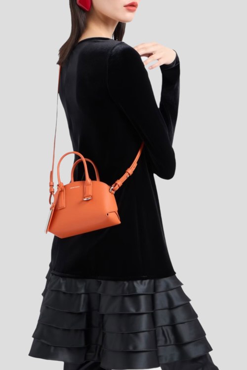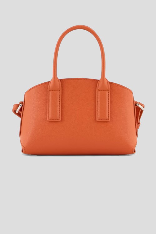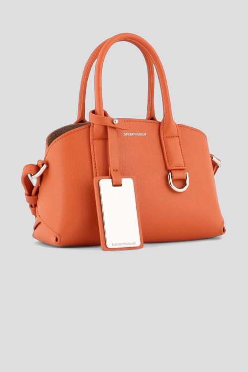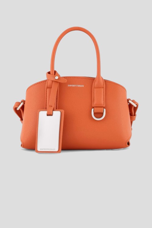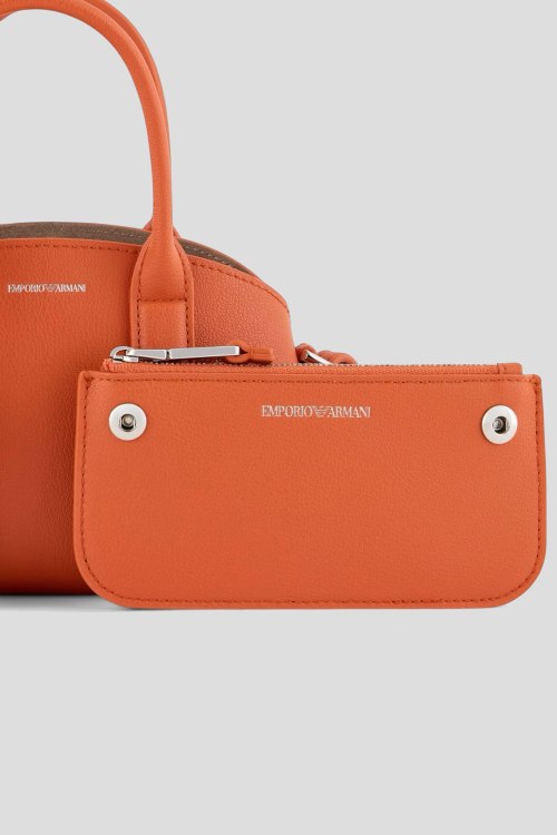 Детали: Женская оранжевая сумка-тоут из экокожи Icon от Emporio Armani (Эмпорио Армани). Принт с логотипом, подвеска с логотипом, серебристая фурнитура, две круглые ручки, съемный плечевой ремень, внутренняя косметичка, одно отделение. Размер: 18 х 7 х 12 см