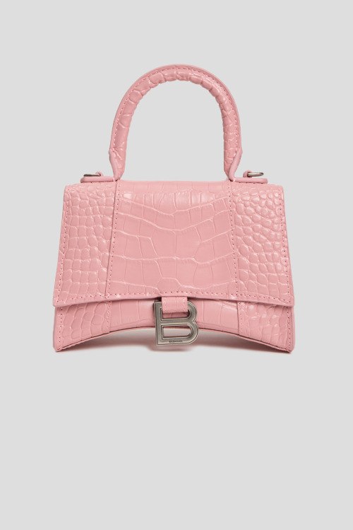 Детали: Женская розовая кожаная сумка-тоут Hourglass Mini от Balenciaga (Баленсиага). Тиснение под кожу крокодила, золотистая фурнитура, съемный регулируемый плечевой ремень, верхняя ручка, металлический логотип B, выгнутое дно, один внешний карман сзади, одно внутреннее отделение, один внутренний карман. Размеры: ширина по низу - 19 см, ширина по верху - 17 см, глубина - 7,5 см, высота 13 см