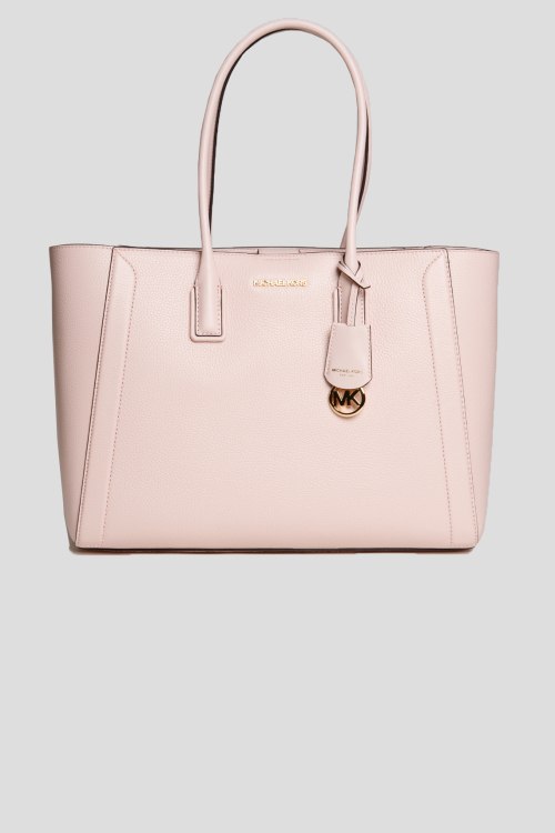 Женская пудровая кожаная сумка-тоут Kali с чехлом для ноутбука от Michael Kors (Майкл Корс). Сумка: модель из зернистой кожи, значок с логотипом, подвеска с логотипом, золотистая фурнитура, две врехние ручки, одно основное отделение, внутренний карман, внутренняя нашивка с логотипом. Размер: 40*20*14 см. Чехол для ноутбука: принт с монограммой бренда, значок с логотипом, золотистая фурнитура, застежка-молния