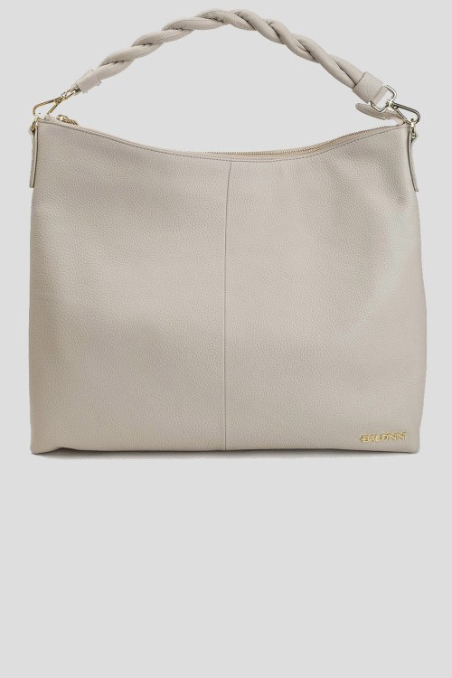 Детали: Женская серая кожаная сумка-тоут от Baldinini (Балдинини). Модель из зернистой кожи, значок с логотипом, золотистая фурнитура, круглая плетеная ручка, съемный плечевой ремень, застежка-молния, одно отделение
