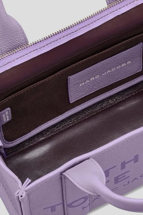 Детали: Женская сиреневая кожаная сумка-тоут The Leather Small Tote Bag от Marc Jacobs (Марк Джейкобс). Модель из зернистой кожи, тиснение логотипа, две круглые ручки, съемный плечевой ремень, застежка-молния, одно отделение. Размеры: 26 x 13 х 21 см