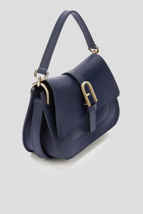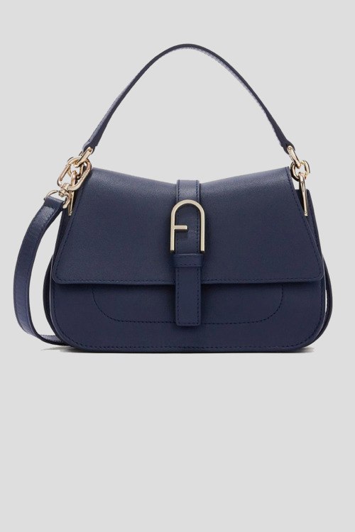Детали: Женская темно-синяя кожаная сумка-тоут Flow от Furla (Фурла). Модель из гладкой кожи, золотистая фурнитура, металлический логотип, застежка на магнит, одно отделение, круглая ручка, съемный плечевой ремень. Размеры: 21,5 x 15 x 8 см