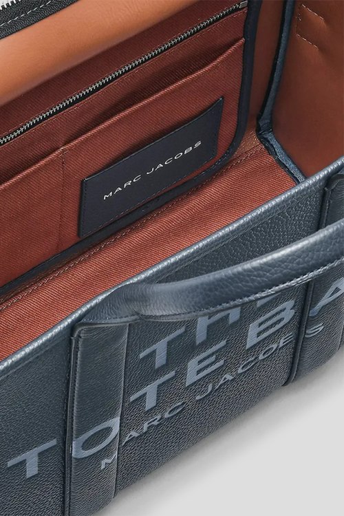 Детали: Женская темно-синяя кожаная сумка-тоут The Leather Medium Tote Bag от Marc Jacobs (Марк Джейкобс). Модель из зернистой кожи, тиснение логотипа, серебристая фурнитура, две круглые ручки, съемный плечевой ремень, застежка-молния, одно отделение. Размеры: 34 x 15 х 27 см