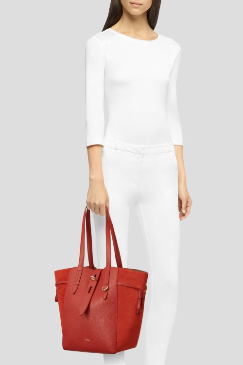 Детали: Женская терракотовая сумка-тоут из кожи и замши Net от Furla (Фурла). Застегивается на хлястик, внутри: 1 отдел, внутренние 2 кармана, один из них на молнии. Размеры: 17 х 19 х 10 см. Высота ручки/ремня: 10/53 см