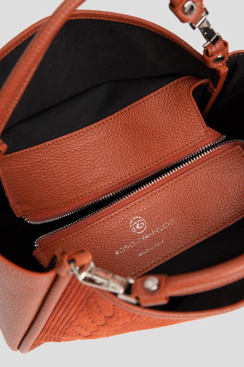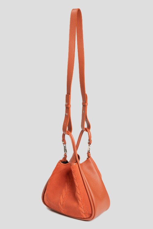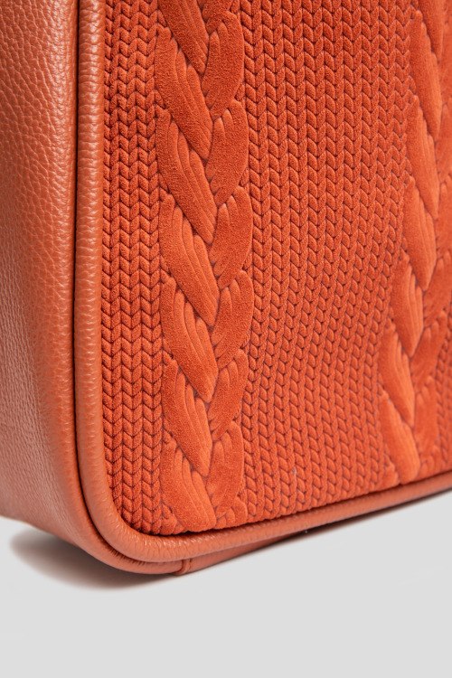 Детали: Женская терракотовая сумка-тоут из натуральной кожи от Roberta Gandolfi (Робэрта Гандолфи). Плетенный дизайн, одно отделение, застежка на молнию, две верхние ручки, съемный плечевой ремень. Измерения: Ширина: 25 см, высота: 22 см, глубина: 12 см