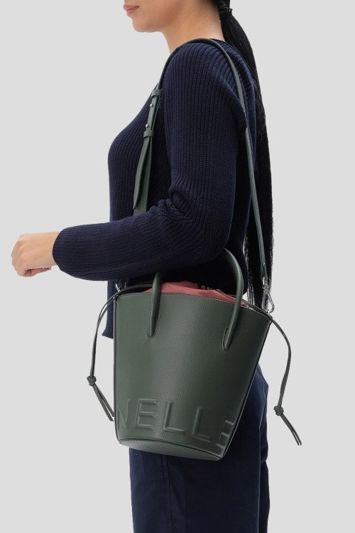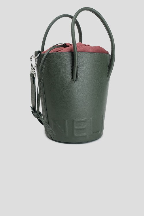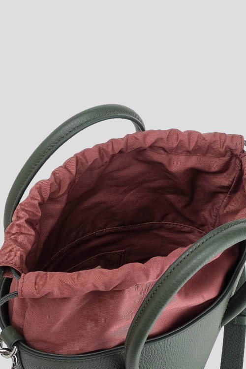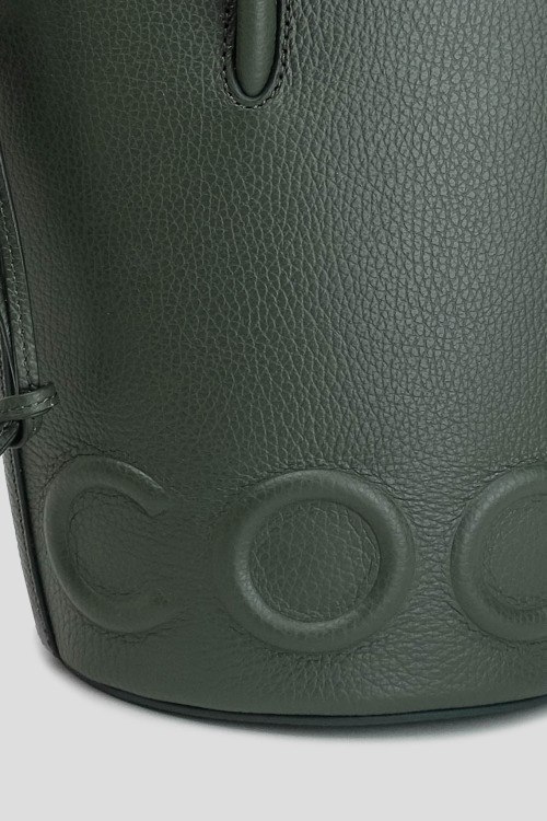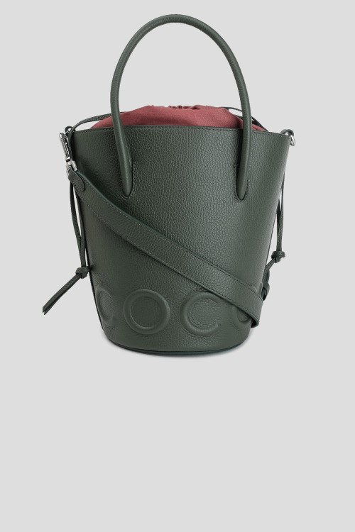 Детали: Женская темно-зеленая кожаная сумка-ведро Myrtha от Coccinelle (Кочинелле). Модель из зернистой кожи, логотип в тон изделия, серебристая фурнитура, две круглые ручки, съемный плечевой ремень, текстильный мешок на затяжке, одно отделение. Размеры: 26 x 23 x 16 см