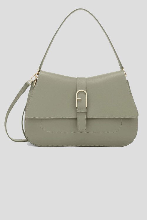 Детали: Женская оливковая кожаная сумка-тоут Flow от Furla (Фурла). Модель из гладкой кожи, золотистая фурнитура, металлический логотип, застежка на магнит, одно отделение, круглая ручка, съемный плечевой ремень. Размеры: 31 х 19 х 11 см