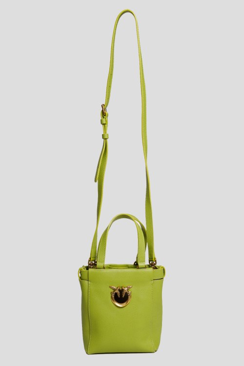 Женская зеленая сумка-тоут из натуральной кожи от Pinko (Пинко). Модель Mini Shopping Bag, одно отделение, застежка на кнопку, две ручки, съемный плечевой ремень, фирменный логотип Love Birds Diamond Cut, в комплекте косметичка. Размер: 17*15*8 см