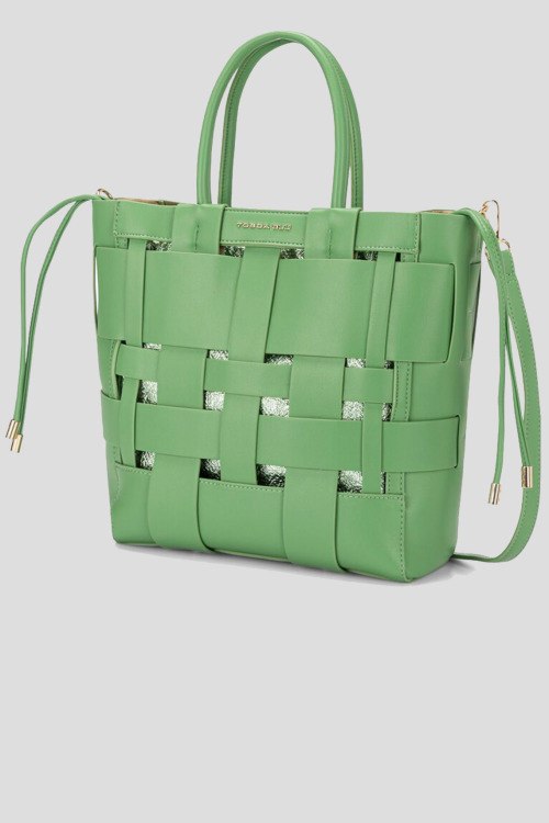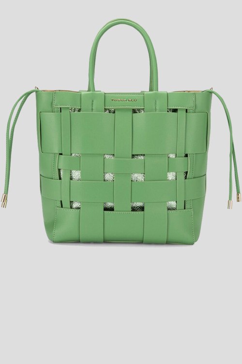 Женская зеленая сумка-тоут из экокожи от Tosca Blu (Тоска Блу). Плетеный дизайн, съемный внутренний мешок, застежка на шнурке и на магните, логотип спереди, две верхние ручки, одно основное отделение, внутренний карман на молнии. Размеры: 37х31х16 см