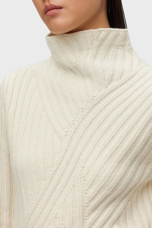 Детали: Женский белый свитер из шерсти и кашемира Frim от Hugo Boss (Хуго Босс). Комбинация материалов, крупная вязка, высокий воротник, длинный рукав, классическая длина