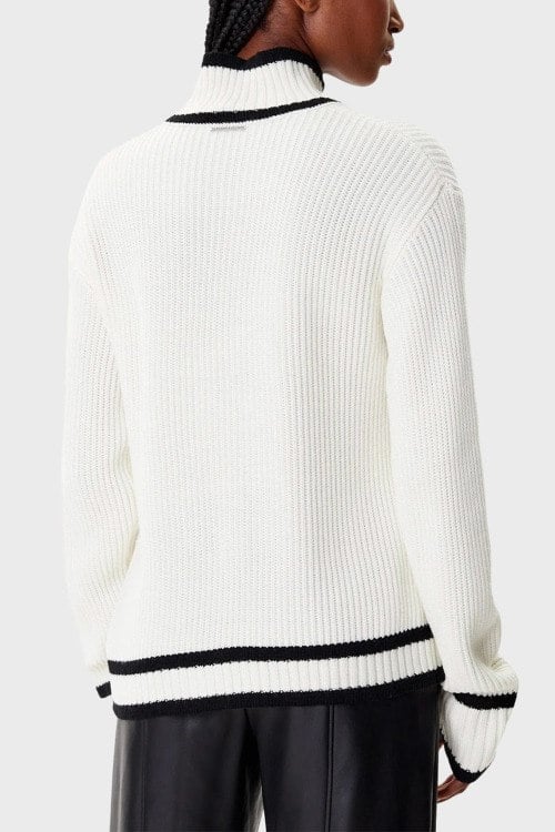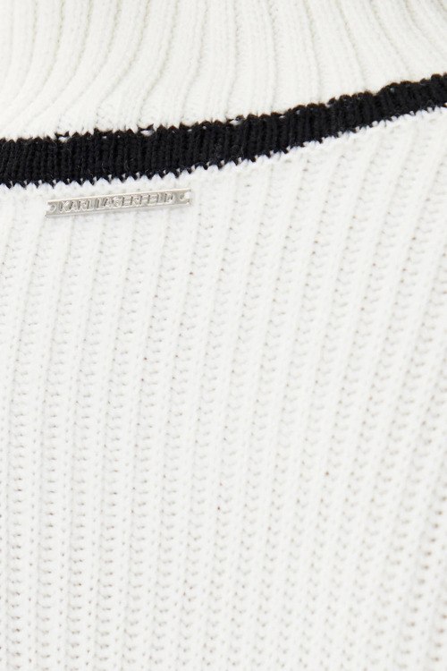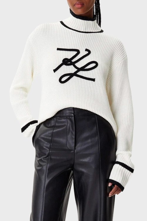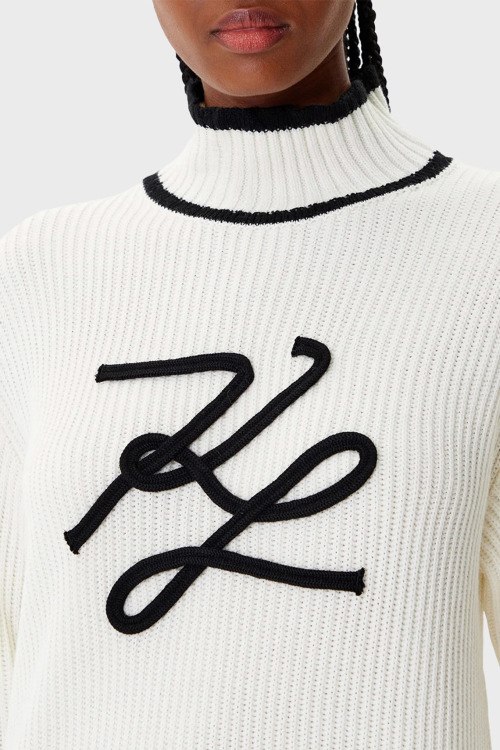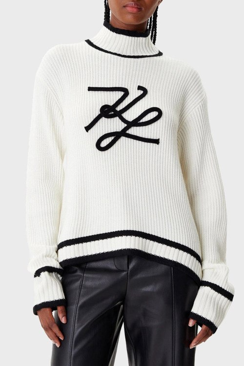 Детали: Женский белый свитер из шерсти и акрила от Karl Lagerfeld (Карл Лагерфельд). Классическая вязка, логотип на груди, высокий воротник, классическая длина