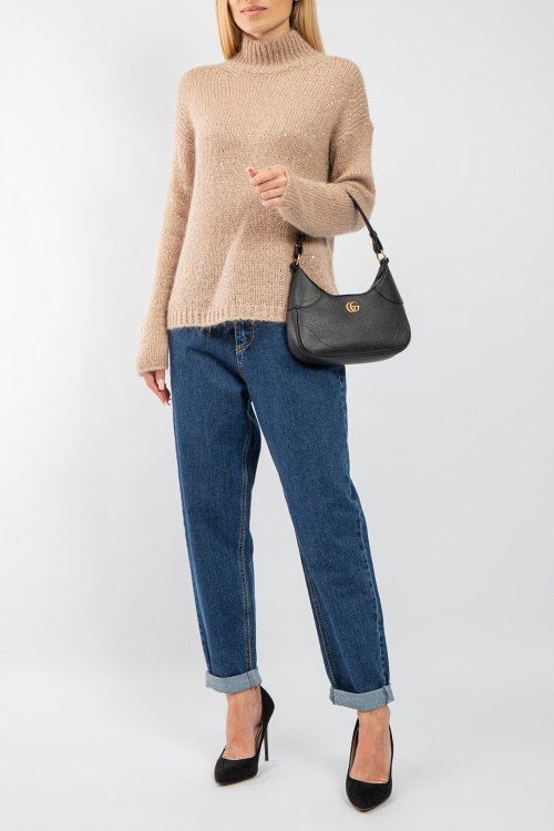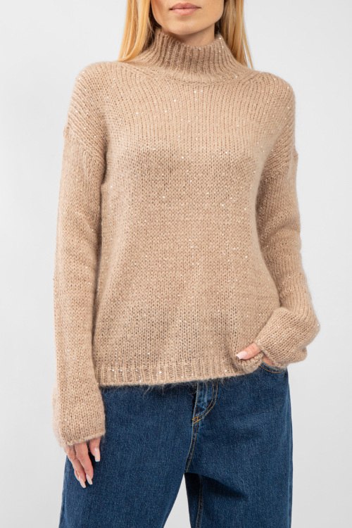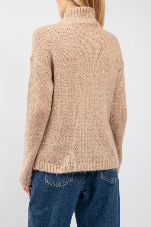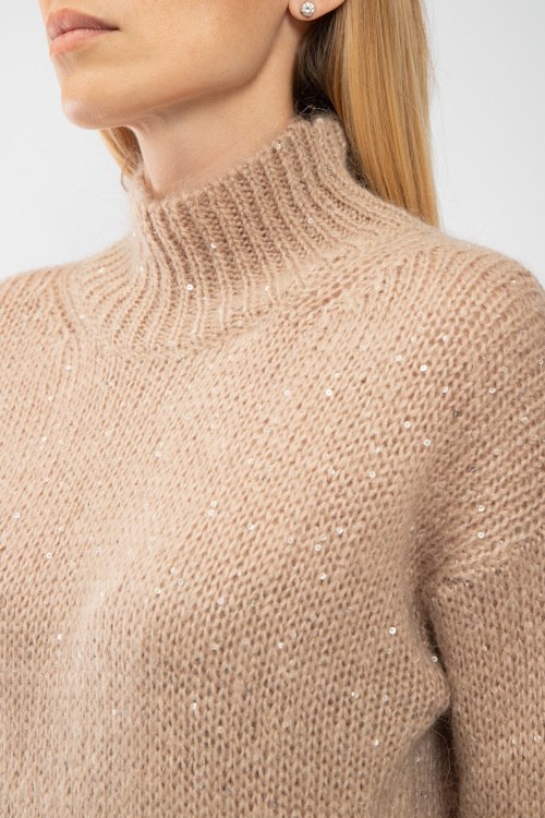 Женский бежевый вязаный свитер от Barbara Alvisi (Барбара Алвиси). Дизайн с пайетками по всей поверхности, высокая горловина, классическая длина. На модели снят размер - S-M. Параметры модели: рост 177 см, 88-62-90 см. Замеры: длина: 60 см, ширина по груди: 51 см, ширина по талии 50 см, ширина рукава 53 см, ширина рукава 16 см