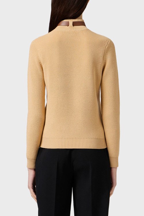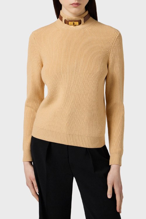 Детали: Женский бежевый свитер из шерсти и акрила от Elisabetta Franchi (Елизабетта Франчи). Классическая вязка, высокая горловина с коричневым чокером, манжеты и нижний край в рубчик