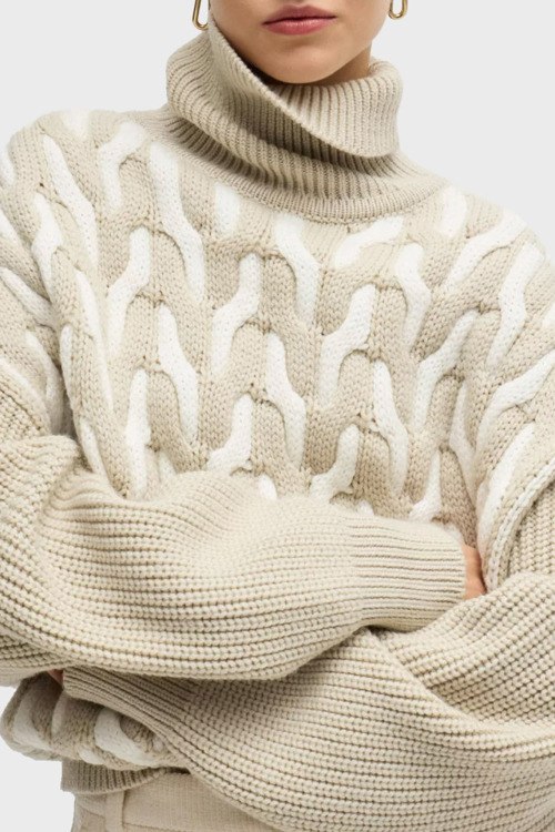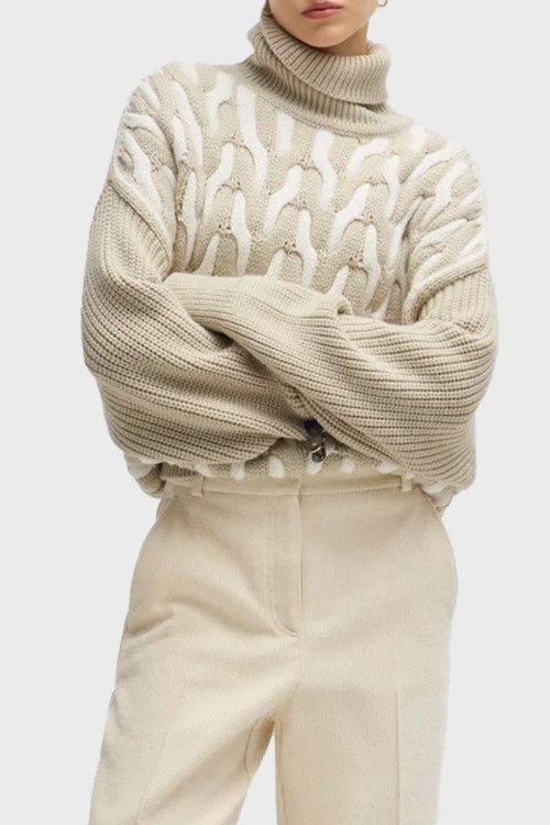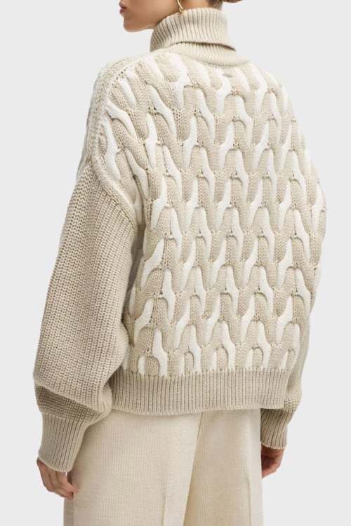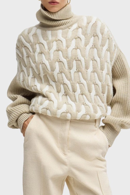 Детали: Женский бежевый свитер Ferdolia из шерсти от Hugo Boss (Хуго Босс). Высокий воротник-стойка с отворотом, длинные рукава, манжеты и низ изделия на трикотажной резинке, приспущенная линия плеча, комбинация материалов