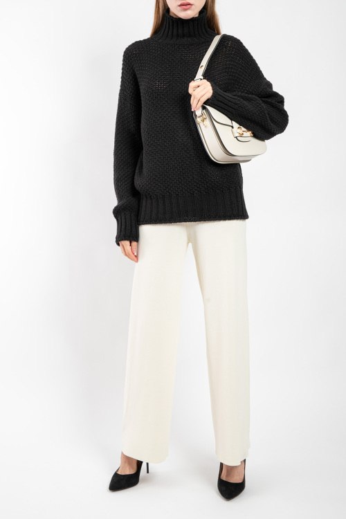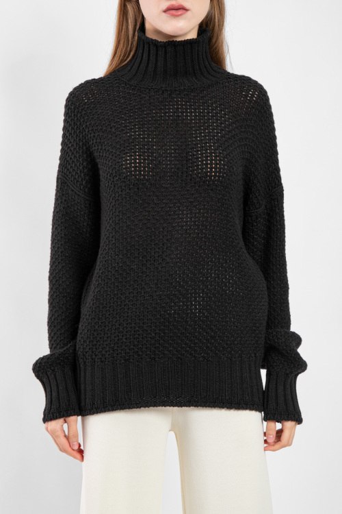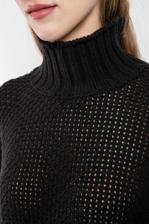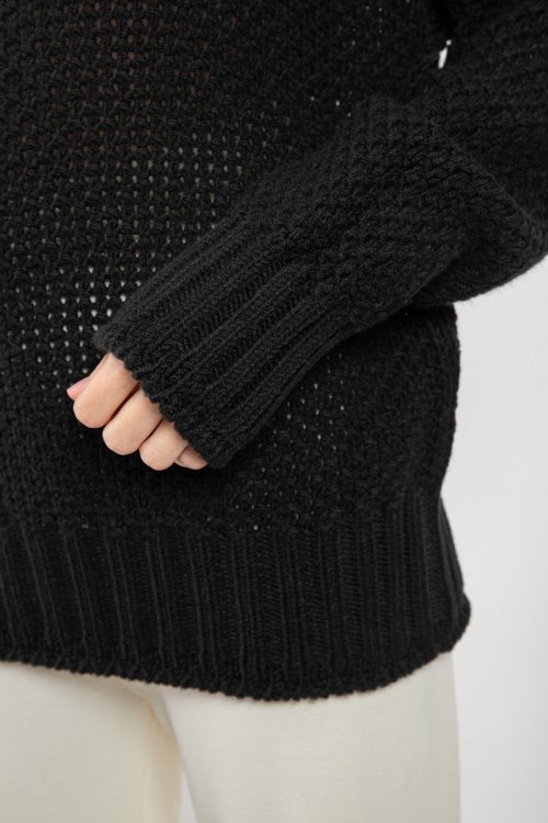 Женский черный свитер из шерстяного микса от Barbara Alvisi (Барбара Алвиси). Перфорированный дизайн, высокий воротник-стойка, длинные рукава, широкая резинка в рубчик. Замеры для размера: S-M длина: 62 см, ширина по груди: 54 см, ширина по талии: 50 см, ширина по бёдрам: 46 см, длина рукава по внутреннему шву: 53 см, ширина рукава: 20 см.