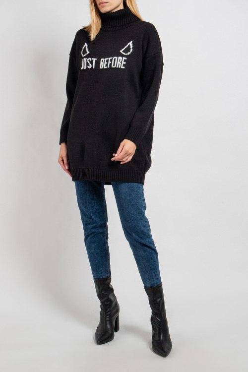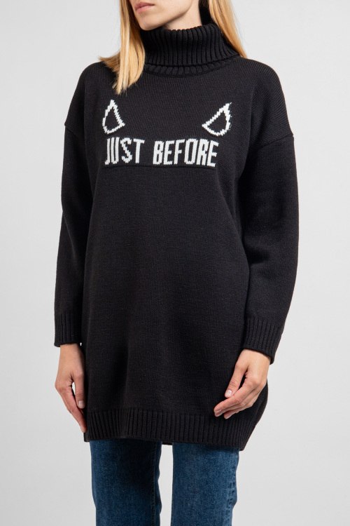 Детали: Женский черный свитер из шерстяного микса от J.B4 Just Before (Джаст Бифо). Удлиненная модель, высокий воротник-стойка, длинные рукава, приспущенная линия плеча, трикотажная резинка на манжетах и по низу изделия, спереди принт с логотипом бренда