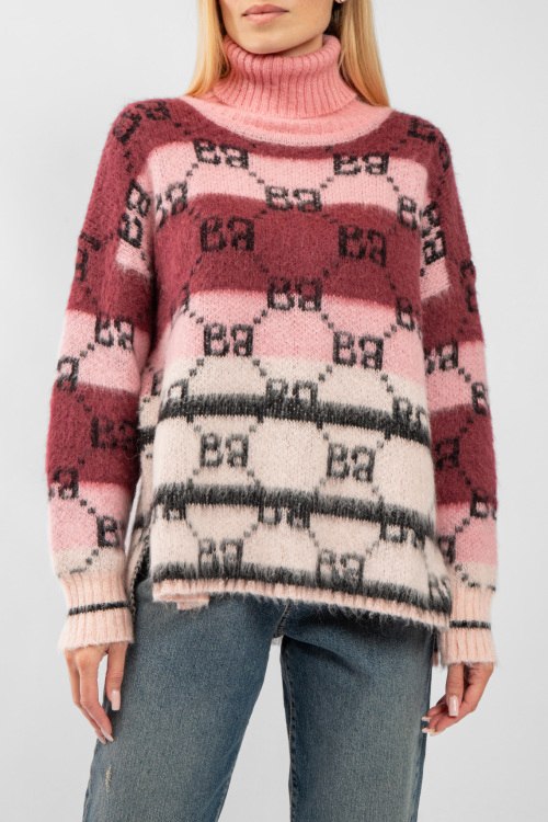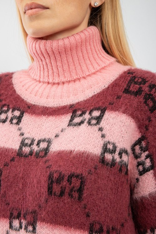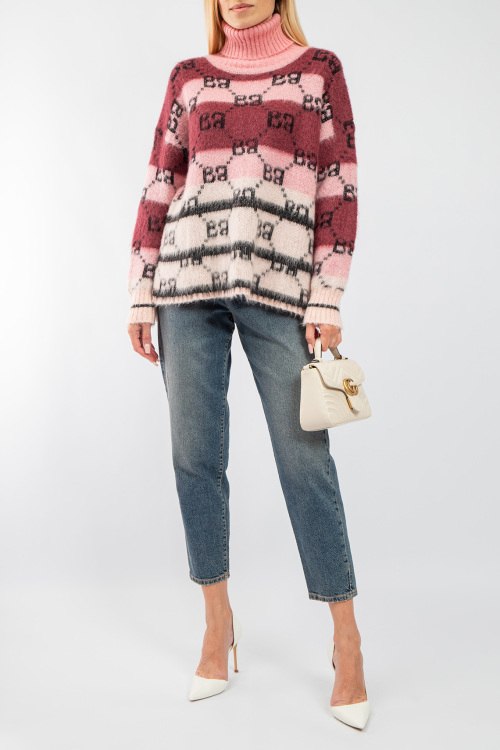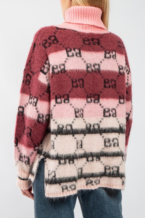 Женский розово-бордовый свитер из акрила и мохера от Barbara Alvisi (Барбара Алвиси). Дизайн колор-блок, узор с монограммой, высокая горловина, разрезы по бокам, классическая длина. На модели снят размер - S-M. Параметры модели: рост 177 см, 88-62-90 см. Замеры: длина: 62 см, ширина по груди: 59 см, ширина по талии 58 см длина рукава по внутреннему шву: 46 см, ширина рукава 21 см