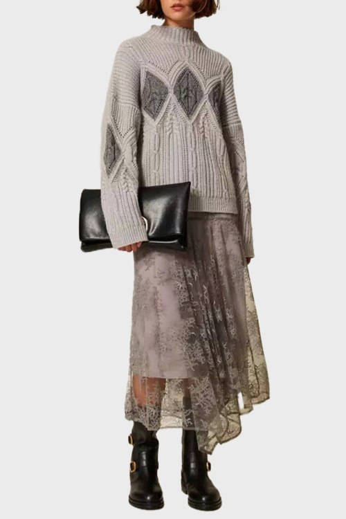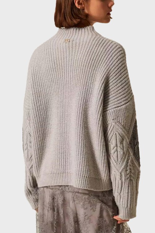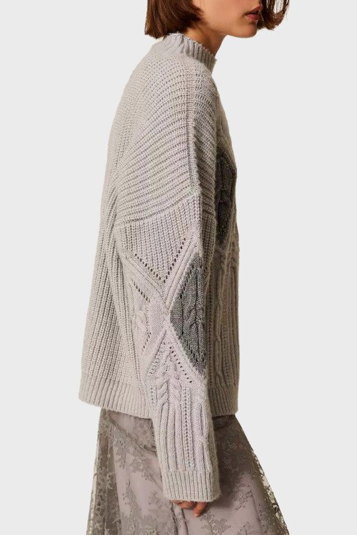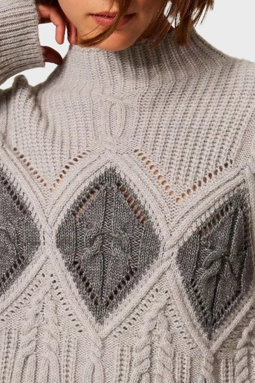 Детали: Женский серый свитер из шерсти и альпаки от TWINSET (Твинсет). Классическая вязка, фактурный узор, воротник-стойка, спущенная линия плеча, свободный фасон, классическая длина