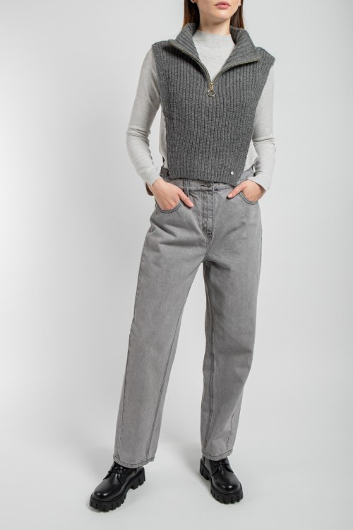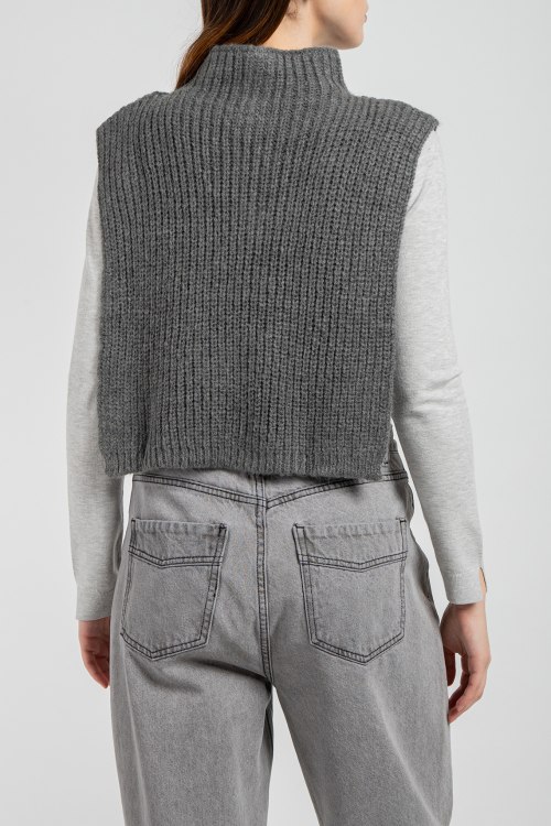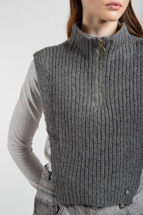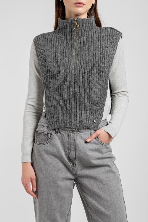 Детали: Женская темно-серая манишка из шерстяного микса от Yerse (Йерс). Классическая вязка, воротник-стойка, застежка-молния, металлический значок с логотипом