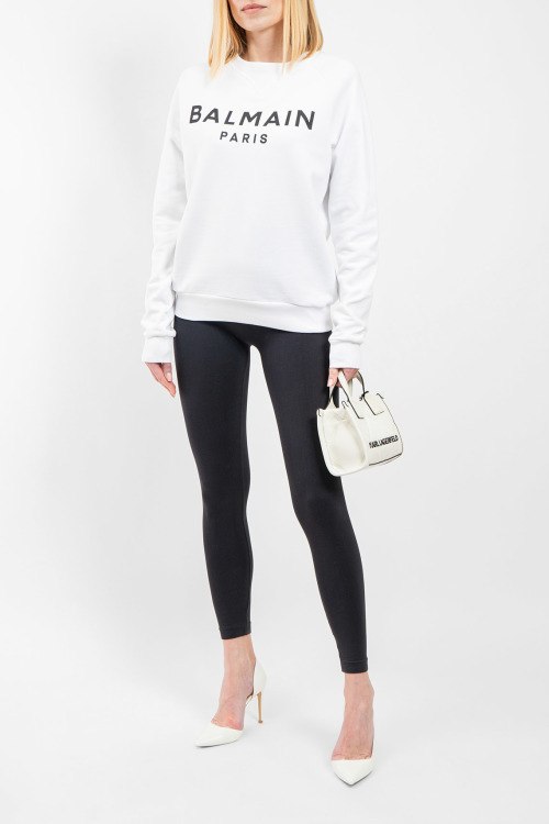 Женский белый хлопковый свитшот от Balmain (Бальман). Принт с логотипом на груди, круглый вырез горловины, классическая длина, трикотажные манжеты и нижний край.