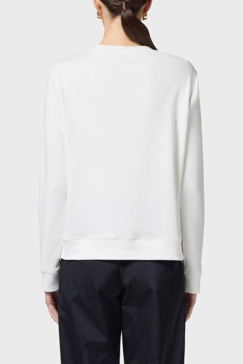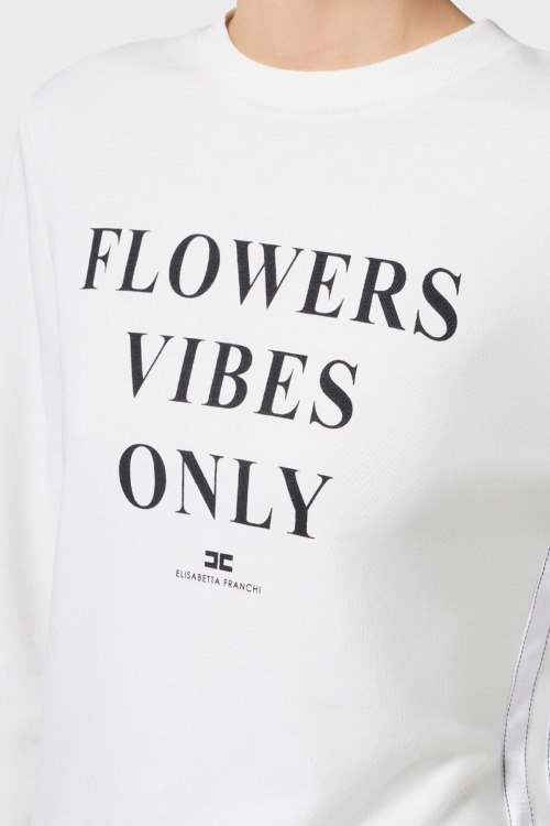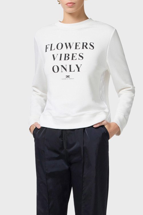 Детали: Женский белый хлопковый свитшот от Elisabetta Franchi (Елизабетта Франчи). Принт с надписью на груди, круглый вырез горловины, классическая длина, трикотажные манжеты и нижний край